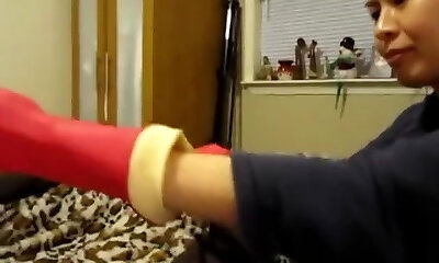 raquel effectue une branlette avec ses gants de latex noir