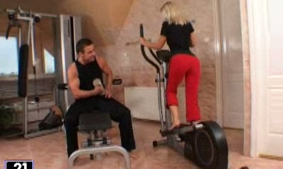 Gorgeous blonde stretches her legs after a workout for a hunk