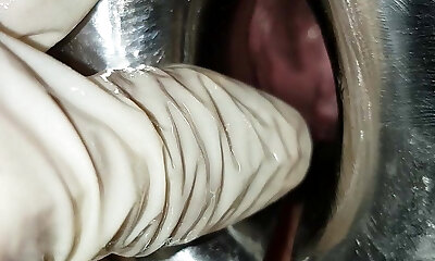 非凡的阴道去指关节深与乳胶手套上