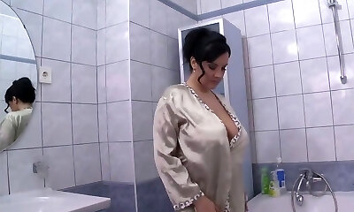Horny milf massages her massive tits in a soapy bubble bath