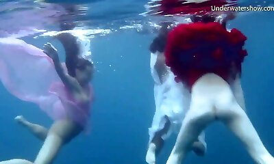 orgie unter wasser und am strandufer mit zwei superheißen blondinen