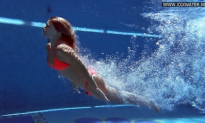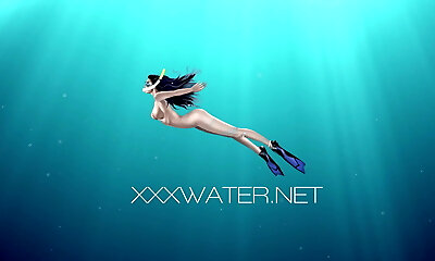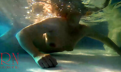 la jolie nageuse aux cheveux noirs chloe montre des nichons et sa chatte sous l'eau