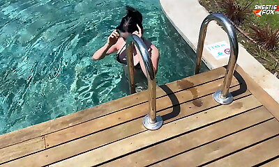 une brune anorexique se fait doubler au bord de la piscine