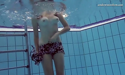 Busty and beautiful fresh redhead honey in the pool disrobes underwater