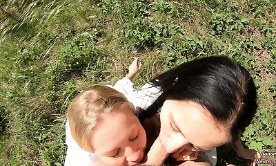 Double Blowjob in the Woods from 2 Smoking Girlfriends